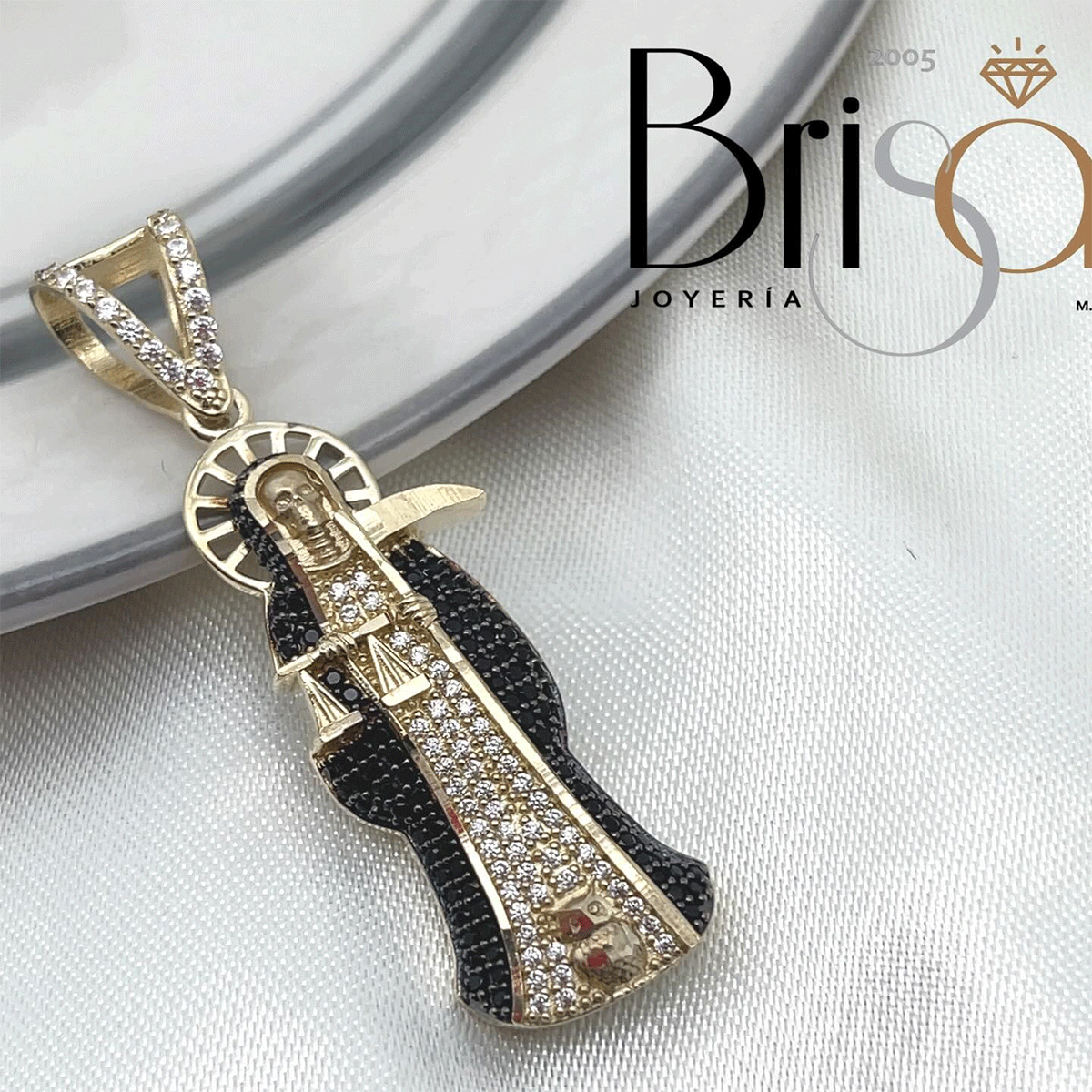 Este poderoso dije representa a la Santa Muerte en su versión negra, símbolo de protección, justicia y transformación. Elaborado en oro sólido de 10 quilates, destaca por el contraste elegante entre las zirconias negras que recubren su manto y las zirconias blancas que adornan su túnica y aureola, creando un juego de luces y sombras que realza cada detalle de la figura.