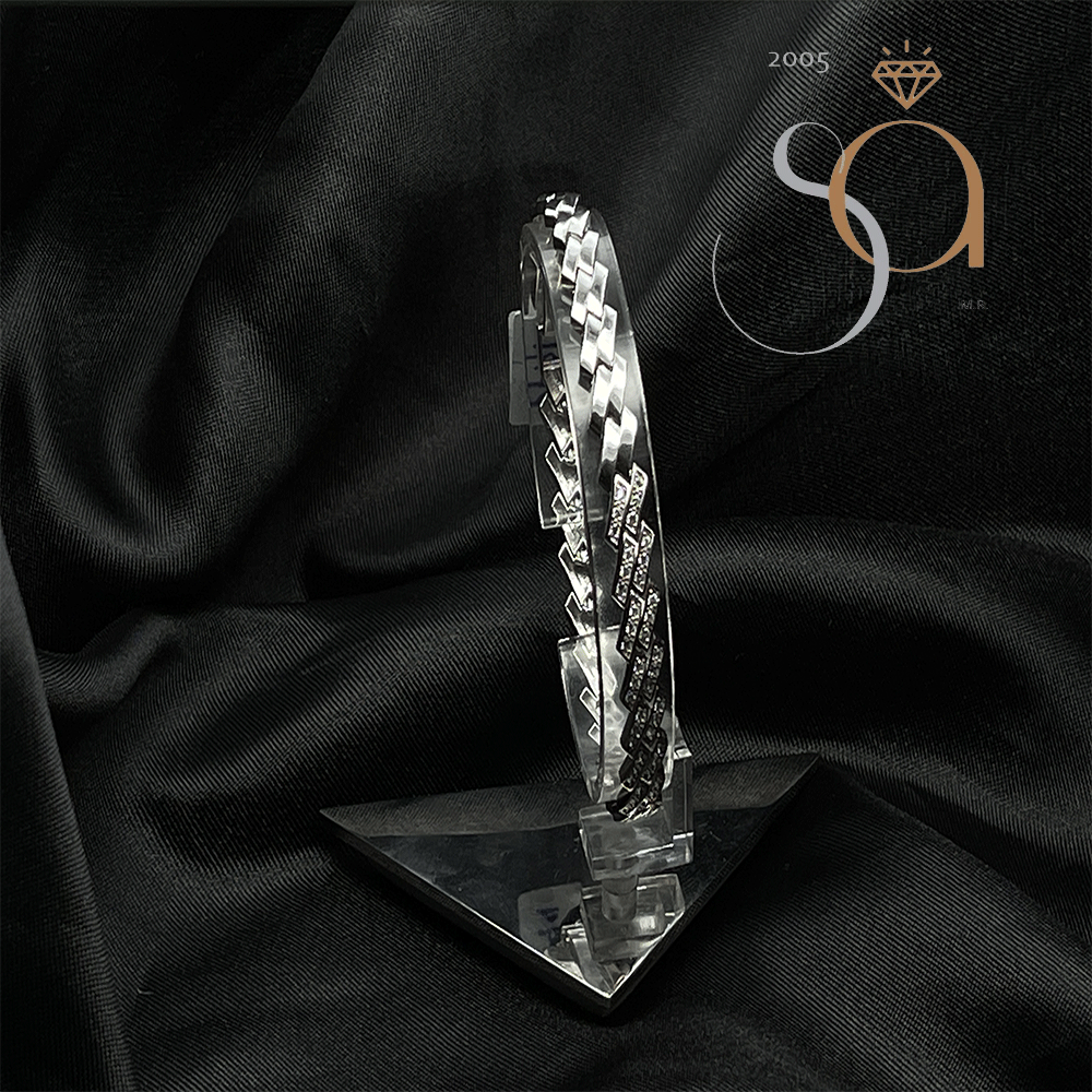 Esta pulsera combina eslabones planos con detalles texturizados y micro incrustaciones, creando un diseño moderno y sofisticado. Su acabado en rodio no solo realza su brillo, sino que también aporta mayor durabilidad y resistencia al uso diario.