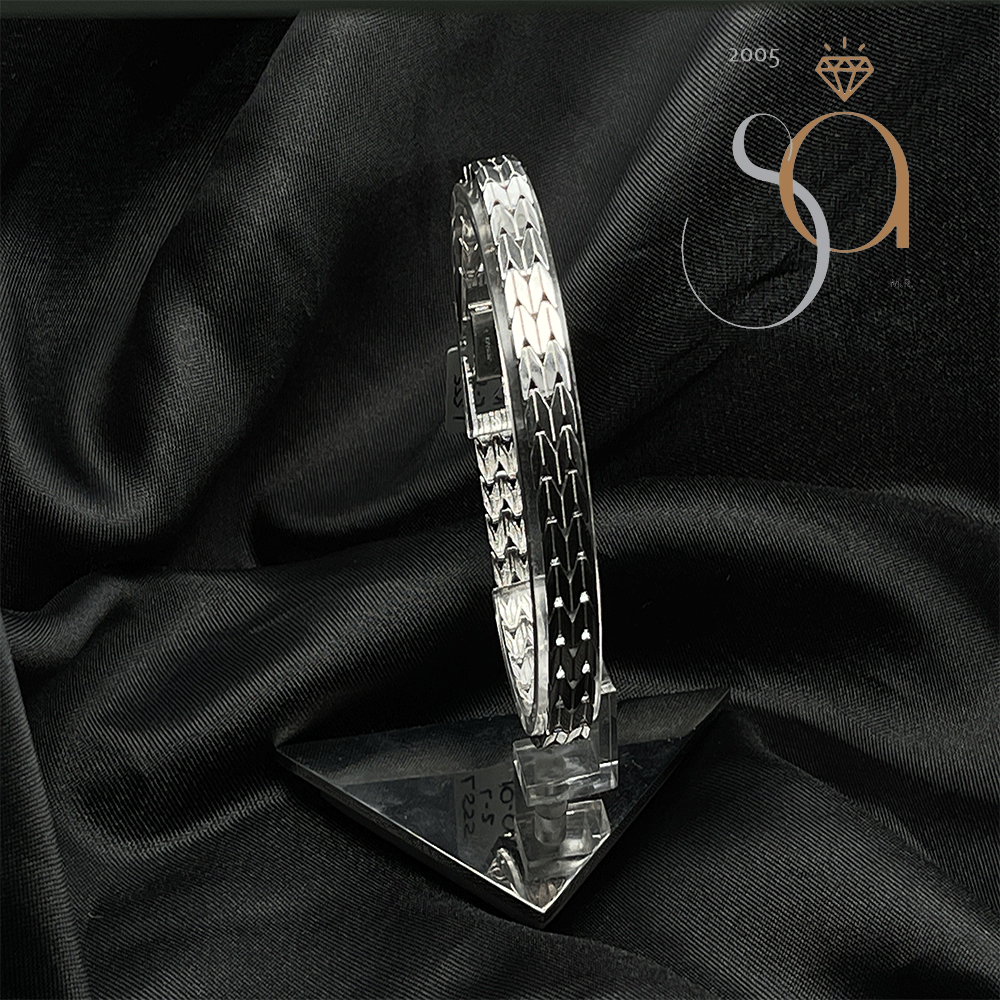 Esta pulsera destaca por su patrón geométrico en relieve que refleja la luz con elegancia, brindando un estilo pulido y contemporáneo. Elaborada en plata .925 con baño de rodio, ofrece resistencia al desgaste y un acabado altamente brillante.