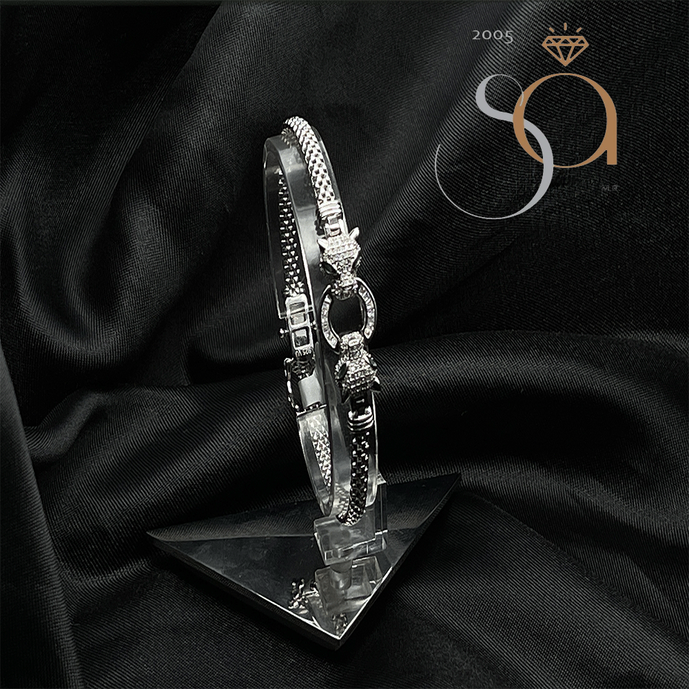 Inspirada en la elegancia de la pantera, esta pulsera destaca por su diseño central con cabezas de felino que sujetan un aro, todo adornado con micro incrustaciones brillantes. Su acabado en rodio le da un toque sofisticado y resistente al desgaste.